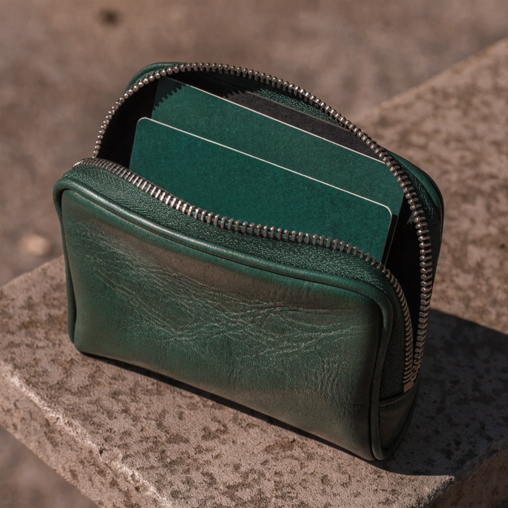 Leather zip pouch with blind embossing.